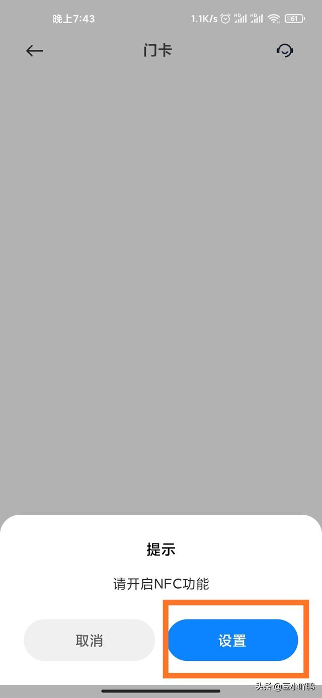 3、在门卡设置页面会有开启NFC功能的提示,点击设置进入在设置页面。