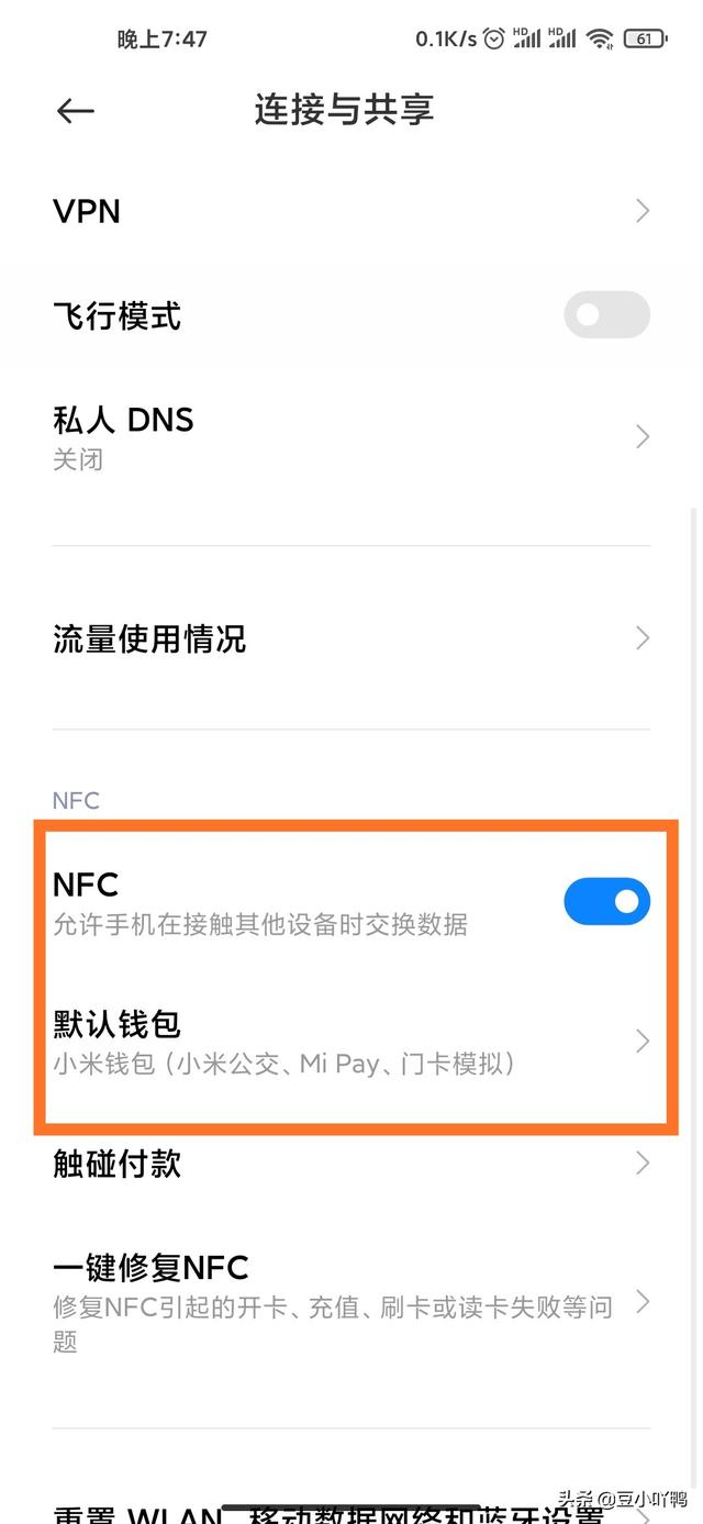 4、进入连接与共享页面,找到NFC按钮,打开之后把门禁卡放到手机背面NFC功能区域附近,不要拿开,手机这时会检测并复制门禁卡内的信息到手机里。