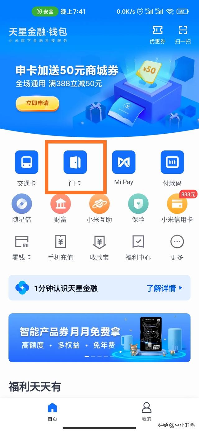 2、进入小米钱包,在主页面就能够看到门卡图标,点击进入。